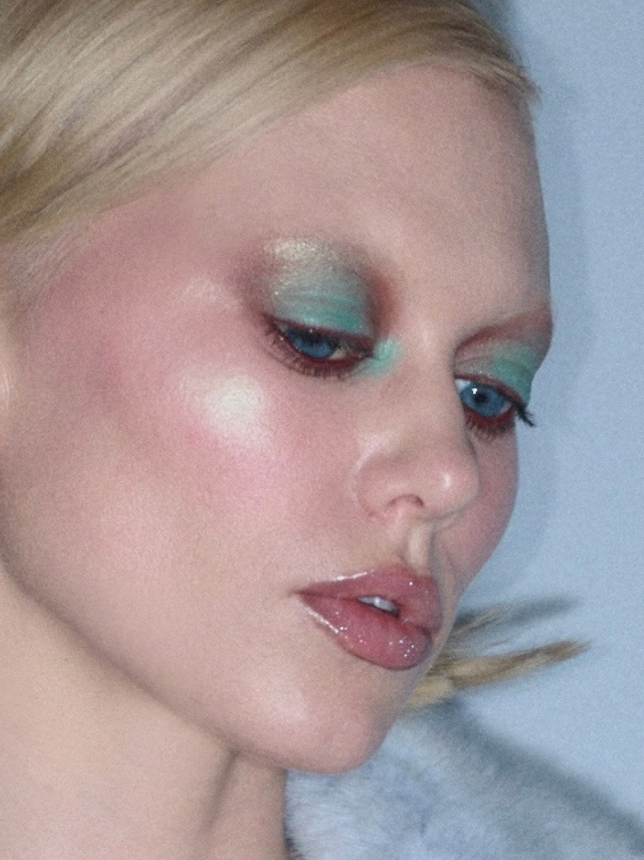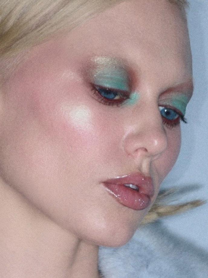 ابدئي باستخدام هايلايتر Bounce & Gleam بلون InvestMint الحصري لموسم العطلات. ”عندما رأيت هايلايتر النعناع، قلت لنفسي، لم أرَ شيئاً مثل هذا من قبل!“ إنه منعش ورائع. بالنسبة للعيون، يحتل الآيشادو الخاص بموسم العطلات بلون Mint Condition مركز الصدارة، ويتباين مع غنى درجات ألوان mocha mousse، المعروف أيضاً باسم Espresso. ”أحببت فكرة شكل العين الغريب الذي يضفي جمالاً ولكنه أيضاً مظهر غريب ورائع.“